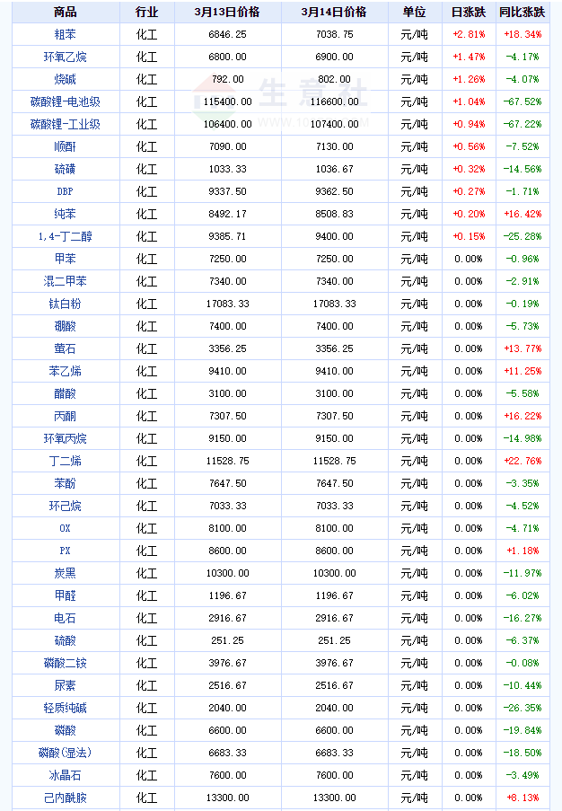 2024年3月14日大宗商品价格涨跌榜中化工板块环比上升的商品共10种,涨幅前3的商品分别为粗苯(2.81%)、环氧乙烷(1.47%)、烧碱(1.26%)。环比下降的商品共有25种,跌幅前3的产品分别为煤焦油(高温)(-4.37%)、黄磷(-4.34%)、重质纯碱(-3.21%)。