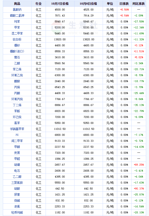 据生意社价格监测,2025年10月8日大宗商品价格涨跌榜中化工板块环比上升的商品共2种,涨幅前2的商品分别为氯酸钠(0.56%)、磷酸二氢钾(0.54%)。