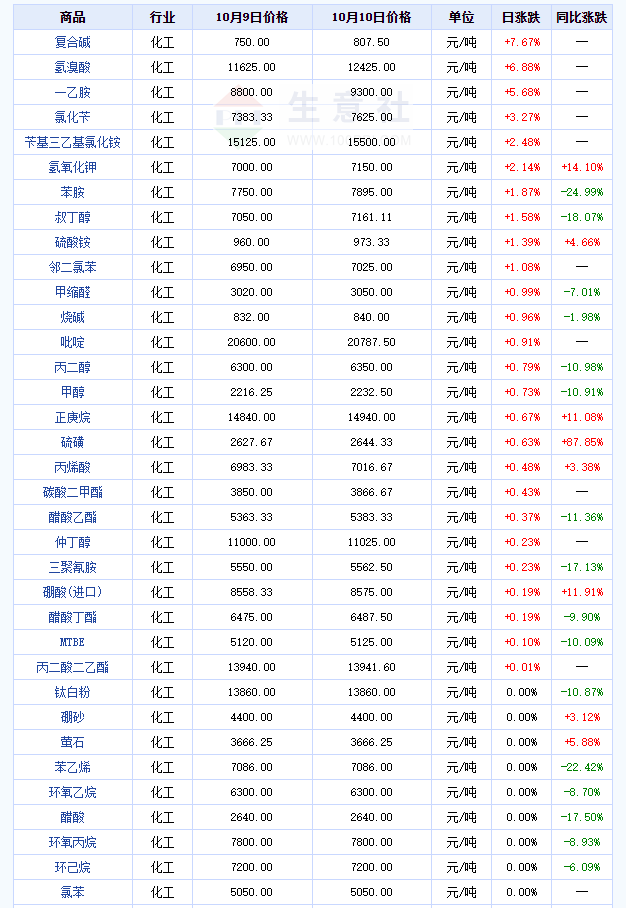 据生意社价格监测,2025年10月10日大宗商品价格涨跌榜中化工板块环比上升的商品共26种,其中涨幅5%以上的商品共3种,占该板块被监测商品数的0.8%;涨幅前3的商品分别为复合碱(7.67%)、氢溴酸(6.88%)、一乙胺(5.68%)。