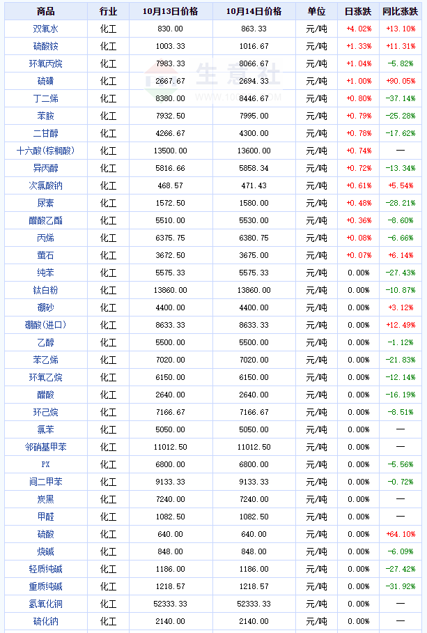 据生意社价格监测,2025年10月14日大宗商品价格涨跌榜中化工板块环比上升的商品共14种,涨幅前3的商品分别为双氧水(4.02%)、硫酸铵(1.33%)、环氧丙烷(1.04%)。