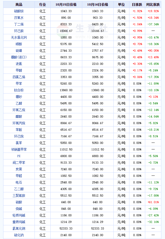 据生意社价格监测,2025年10月16日大宗商品价格涨跌榜中化工板块环比上升的商品共11种,涨幅前3的商品分别为硫酸铵(1.92%)、双氧水(1.50%)、丁二烯(1.04%)。