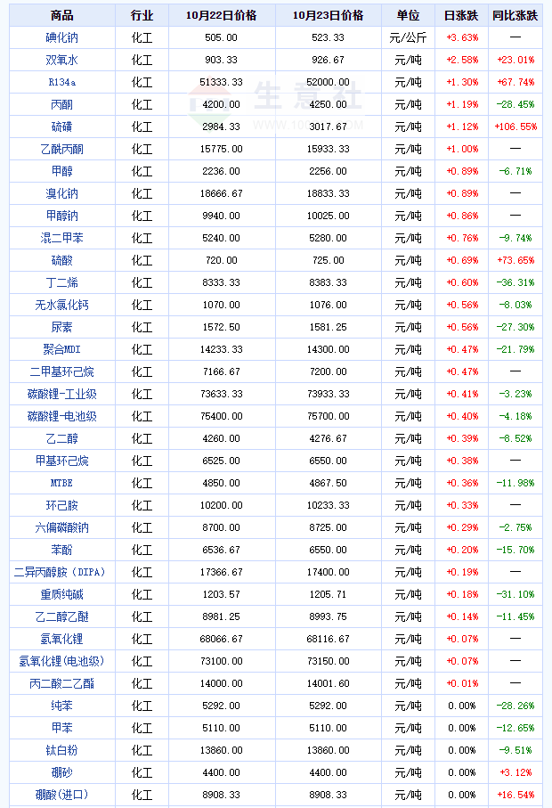 据生意社价格监测,2025年10月23日大宗商品价格涨跌榜中化工板块环比上升的商品共30种,涨幅前3的商品分别为碘化钠(3.63%)、双氧水(2.58%)、R134a(1.30%)。