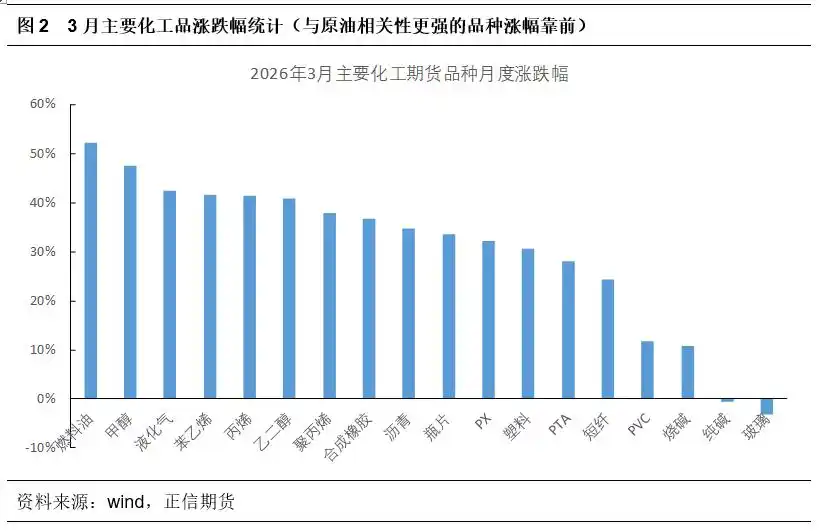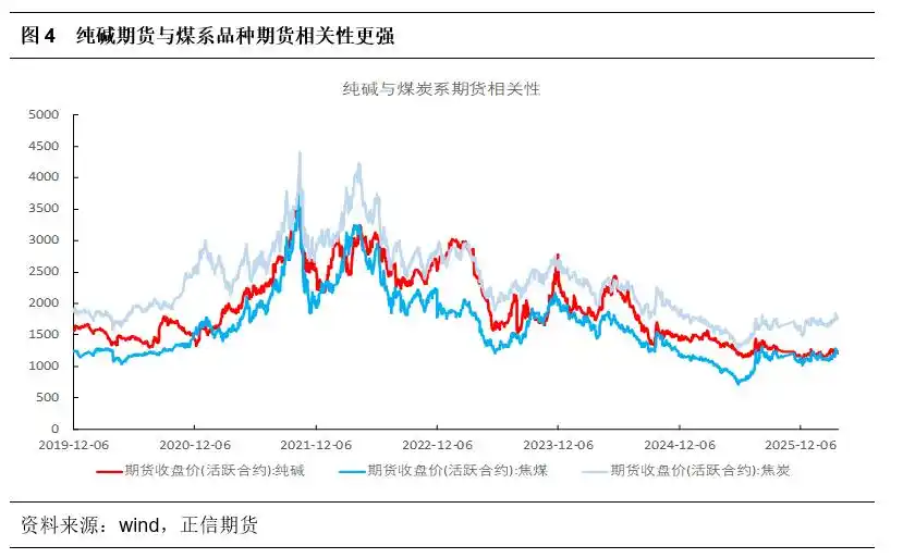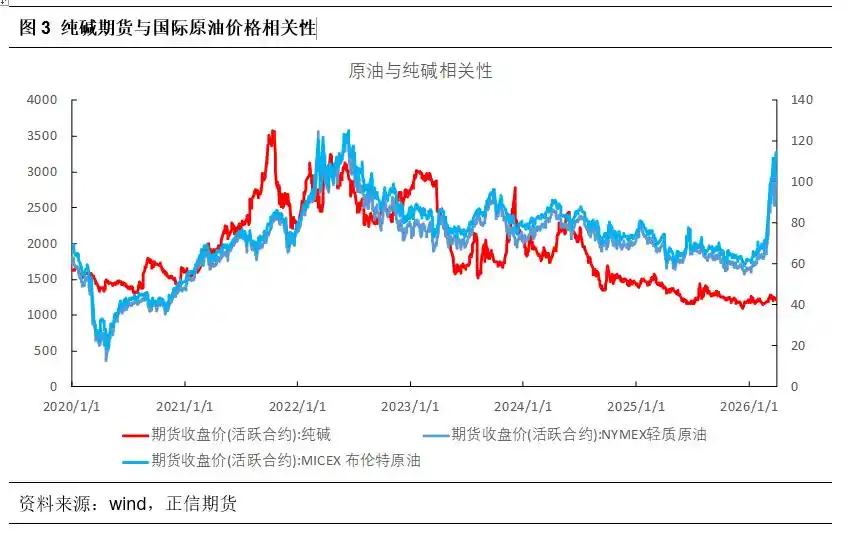 地缘影响带来原油价格明显上涨,多数化工品跟随,但纯碱并未能跟随上涨。中东地区作为全球能源核心,3月以来局势持续紧张是本轮油价上涨的最直接原因,霍尔木兹海峡承担全球约 20%-30% 海运原油贸易,随着通行受阻,油轮航运成本费用飙升。市场对原油供应中断的恐慌情绪迅速蔓延,地缘风险溢价被大幅推高,直接引爆了油价的涨势。在原油价格暴涨的带动下,石油化工产业链上的众多品种纷纷跟随上涨,从上游的石脑油、乙烯、丙烯,到中游的纯苯、甲醇、乙二醇,再到下游的聚乙烯、聚丙烯、苯乙烯等产品,价格均出现了显著的涨幅(盐化工板块涨幅较小,PVC仅30%乙烯法产能受影响),但纯碱并未能明显跟涨,主要在于本次原油的上涨并未在成本端或者原料供应端直接影响到纯碱产业,月内纯碱阶段性上涨更多受资金情绪影响。一般而言,原油单日波动大时,相关性更加明显;油价窄幅震荡时,纯碱自身供需基本面影响为主。从纯碱期货上市以来看,在2021.01—2022.06间通胀上行期,原油上涨带动能源成本上行,商品指数牛市吸引资金,纯碱跟随板块上行,相关性显著提升(这阶段也有国内双碳政策影响煤炭价格),其余阶段以纯碱基本面占据主导,与原油相关性不明显。