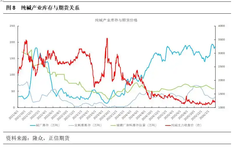 从库存表现来看,国内纯碱厂家总库存维持在185万吨左右的历史高位,如此庞大的库存量,如同悬在市场上方的“堰塞湖”,对价格形成了持续的压制,任何价格的反弹都可能引发套保盘和现货抛压,使得纯碱价格难以有效上涨。从中下游来看,多数预计延续刚需低价补货,截至3月下旬,玻璃厂内原料库存加上在途库存28天左右,交割库库存在30万吨左右,在维持原料安全库存下,或难有集中且持续的补货行为。