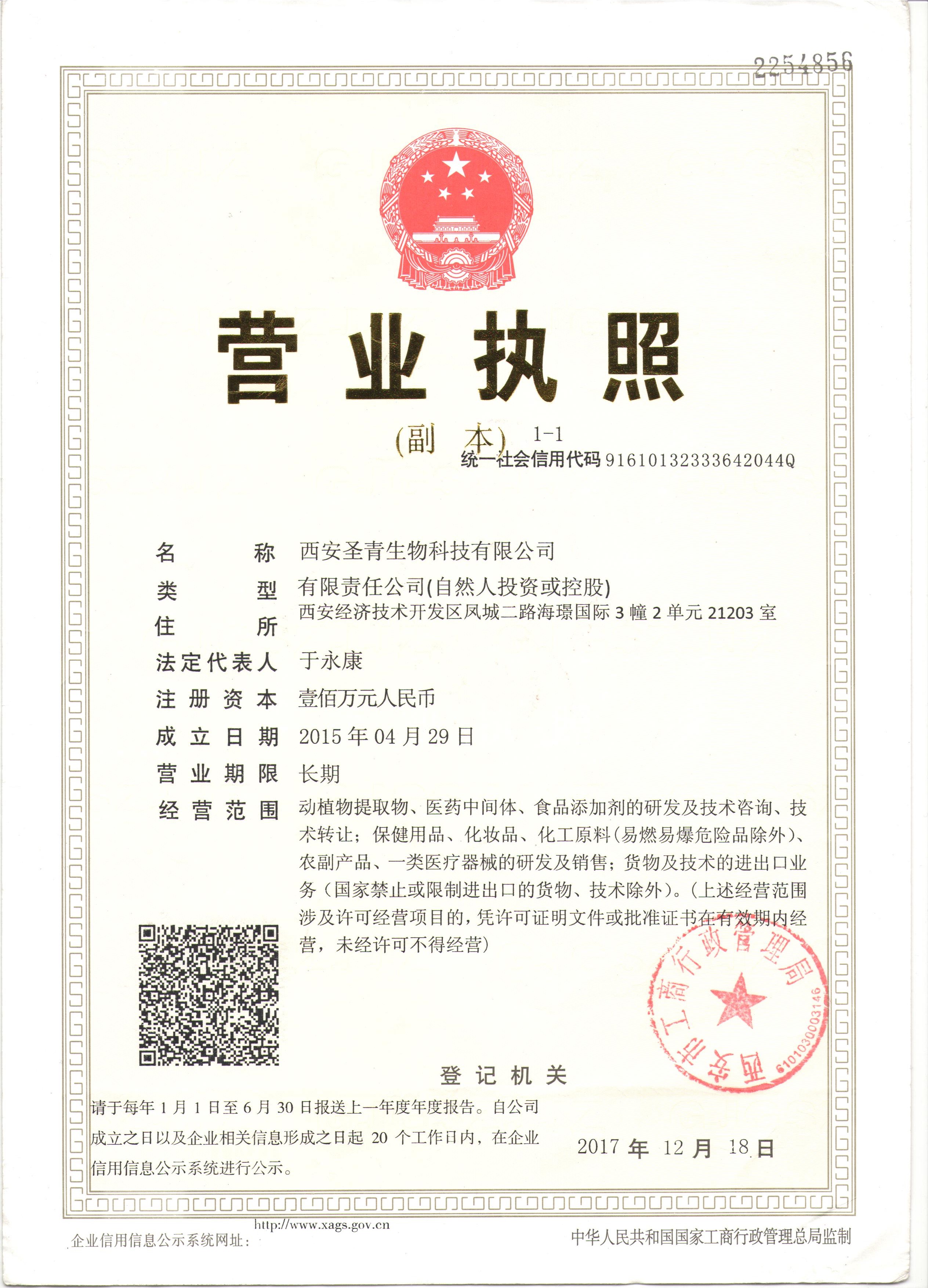 西安圣青生物科技有限公司是一家专业致力于天然药用植物活性成分、医药中间体的研究、开发、销售为一体的高新技术企业。同时与多所高校长期保持合作。 公司拥有完善的提取、分离、精制干燥技术,具有丰富的天然植物提取物的经验并建起了完善的销售服务体系,产品远销美国、欧洲、中东及亚太等五大洲,赢得良好的国际信誉。 公司坚信质量是企业的生命,“可靠的质量,优质的服务”是我们对每个客户的承诺,我们始终致力于为客户提供他们所亟需的可靠产品和优质服务。 西安圣青生物科技有限公司的诚信、实力和产品质量已获得业界的认可。欢迎各界朋友莅临参观、指导和业务洽谈。本公司产品为植物提取物原料,只作为加工生产成品原料使用,不适合个人使用。请根据配方添加生产,购买本产品代表已经知晓产品注意事项和用法禁忌。