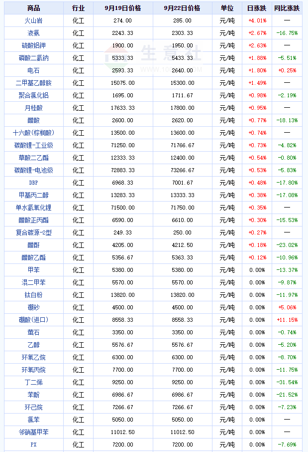 据生意社价格监测,2025年9月22日大宗商品价格涨跌榜中化工板块环比上升的商品共20种,涨幅前3的商品分别为火山岩(4.01%)、液氨(2.67%)、硫酸铝钾(2.63%)。